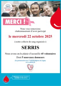 Résultats de la collecte du 22 octobre 2025 à Serris La prochaine collecte aura lieu le lundi 23 mars 2026. A bientôt ! ADSBRL2025-10-24T17:13:27+02:0024 octobre 2025|FB, Résultats des collectes, Serris| Partagez cette information sur vos réseaux préférés FacebookXLinkedInWhatsAppEmail Articles similaires Résultats de la collecte du 21 octobre 2025 à Saint-Thibault-des-Vignes 24 octobre 2025 | 0 commentaire Résultats de la collecte de Villeparisis du 10 octobre 2025 18 octobre 2025 | 0 commentaire Résultats de la collecte de Champs-sur-Marne du 8 octobre 2025 9 octobre 2025 | 0 commentaire Lognes, jeudi 6 novembre 2025 8 octobre 2025 | 0 commentaire